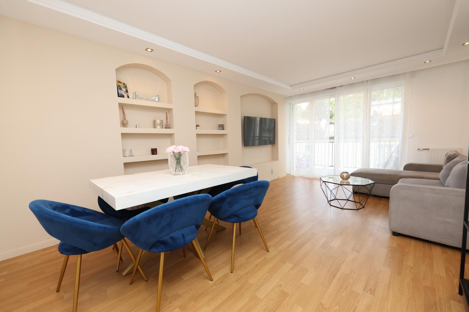 Le salon a été entièrement rénové avec la pose d’un parquet en bois massif, apportant chaleur et élégance à la pièce. Ce revêtement de sol est parfait pour un espace de vie confortable et résistant.